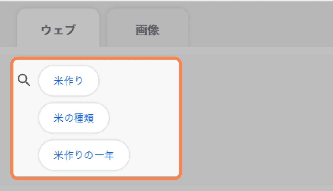 検索結果の前に、みんなにほかにも調べてみてほしいキーワードを並べているよ。クリックするとそのまま検索できるよ。